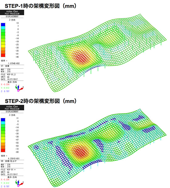 Step-1 1.5mグリッド格子を6mm鋼板で組み上げ、形状決定を軽量鉄骨で自在に設定可能な構造を採用し、施工時には最小限の足場で実現させる。