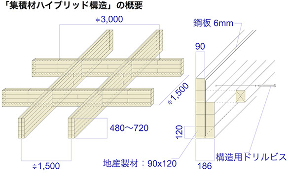 Step-2 鋼板に90×120(長さ約3m)の製材を一体化。製材同士の接合にはラグ・スクリューボルトを使用。製材と鋼板の接合には、「構造用ドリスビス」を用いて、先孔なしの組み上げを実現させる。