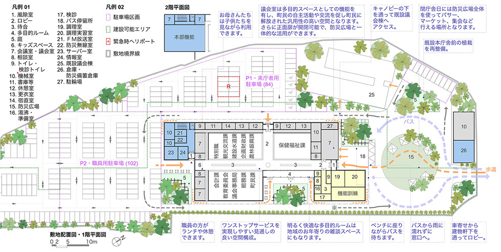 大きな屋根の大空間下に全ての窓口を建物中心に配置して各行政部門のワンストップサービスの円滑化を推進。組織改編にも柔軟に対応できる快適なバリアフリー空間。防災センターは敷地中央に2層に配置されて災害時に町民から信頼される司令塔に。議会室は多目的スペースとしての機能を有し、町民の自主活動や交流を促し町民に解放された汎用性の高い空間となります。