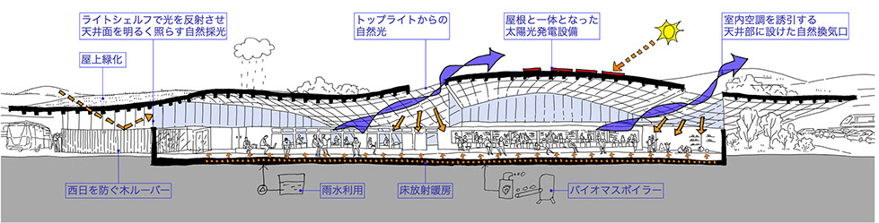 波打つ形の大屋根により外部風を取込み、かつ誘引して排気する自然換気の動きをつくる。西面の木製ルーバーは強い西日を防ぎ、かつ上部のライトシェルフからは反射自然光によって天井面を照らす。自然光に溢れた快適で健康的な空間デザインで風景と建物を融合する。